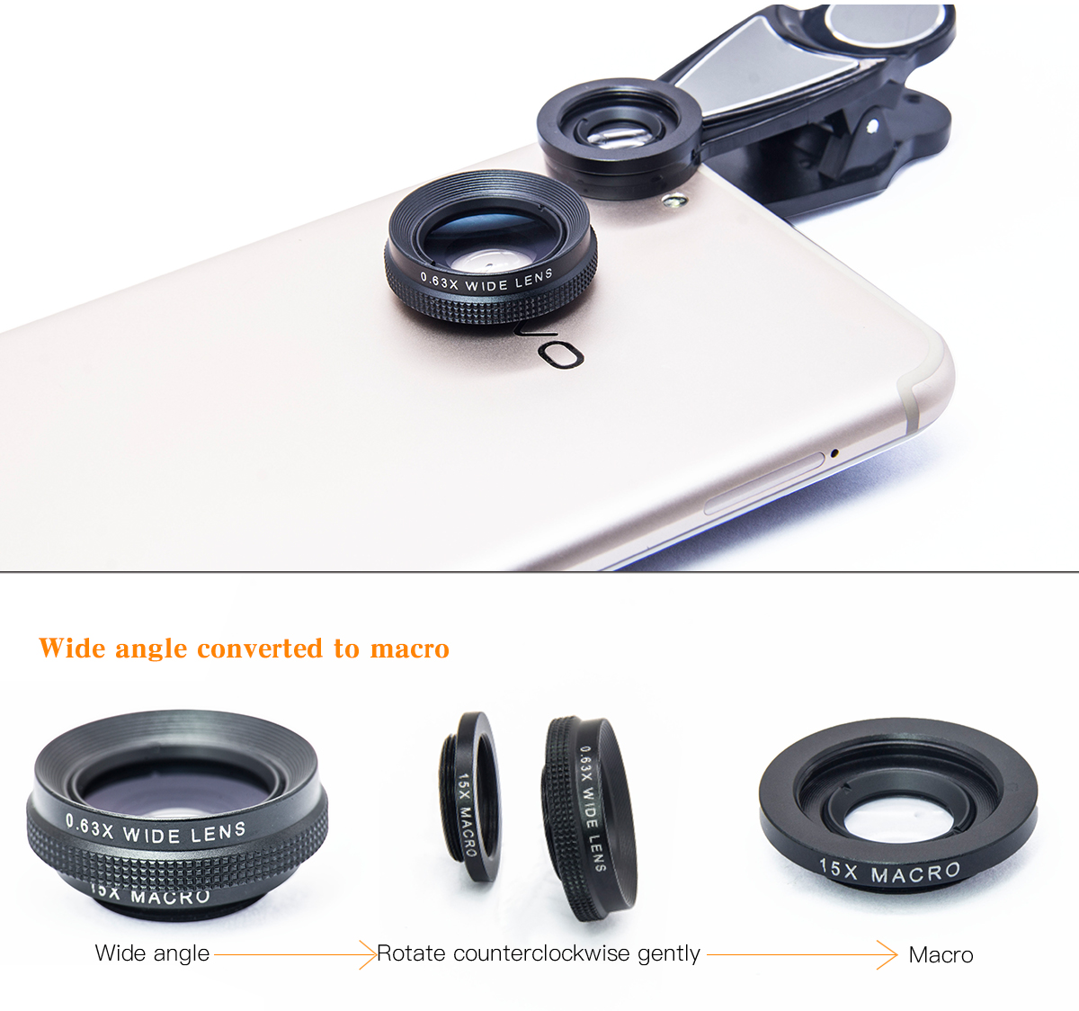 0.63X wide angle lens with 15X macro lens suitable for 99% mobile phones and tablets on the market. It is made by aviation aluminum and optical glass, high quality and low price.